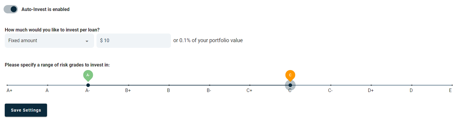 Auto Invest allows you to automatically commit to purchasing notes of loans on the goPeer platform. These commitments are made based on pre-defined risk criteria that you set.